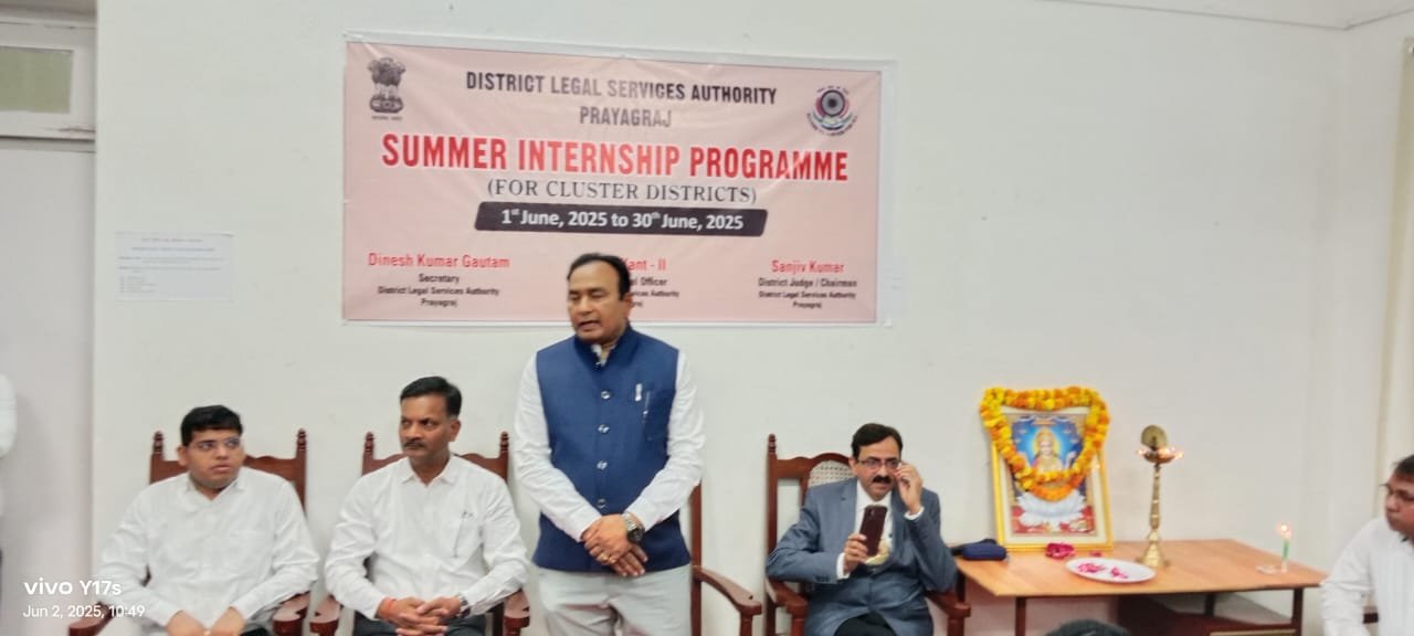 प्रयागराज । प्रातः 10:00 बजे उत्तर प्रदेश राज्य विधिक सेवा प्राधिकरण लखनऊ के निर्देशानुसार व माननीय जनपद न्यायाधीश/अध्यक्ष, जिला विधिक सेवा प्राधिकरण, प्रयागराज संजीव कुमार के आदेशानुसार (12) बारह जनपदों के विधि छात्र-छात्राओं का समर इंटर्नशिप कार्यक्रम (जोनल) प्रशिक्षण का शुभारंभ माननीय प्रभारी जनपद न्यायाधीश मनराज सिंह के द्वारा दीप प्रज्वलित करके किया गया। इस अवसर पर नोडल अधिकारी लोक अदालत रविकांत, श्री प्रेम बहादुर सिंह स्पेशल सी0जे0एम0, शशि कुमार एसीजेएम, मृत्युंजय कुमार एसीजेएम व अन्य अधिकारी के साथ-साथ (12) बारह जनपदों के विधि छात्र-छात्राएं व प्रयागराज के समस्त विधि कॉलेज के छात्र छात्राओं के साथ,कर्मचारीगण व समस्त लीगल एड डिफेंस काउंसिल उपस्थित रहे।